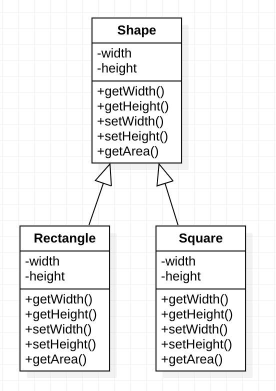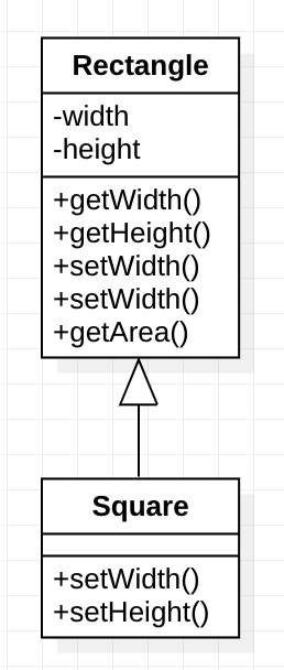 LSP를 위반하는 전형적인 예로, 너비와 높이의 조회(getter) 및 할당(setter) 메서드를 가진 직사각형 클래스로부터 정사각형 클래스를 파생하는 경우를 들 수 있습니다. 정사각형 클래스는 항상 너비와 높이가 같다고 간주할 수 있습니다. 정사각형 객체가 직사각형을 다루는 문맥에서 사용되는 경우, 정사각형의 크기는 독립적으로 변경할 수 없기 때문에 (혹은 그래서는 안되기 때문에) 예기치 못한 행동을 하게 됩니다.