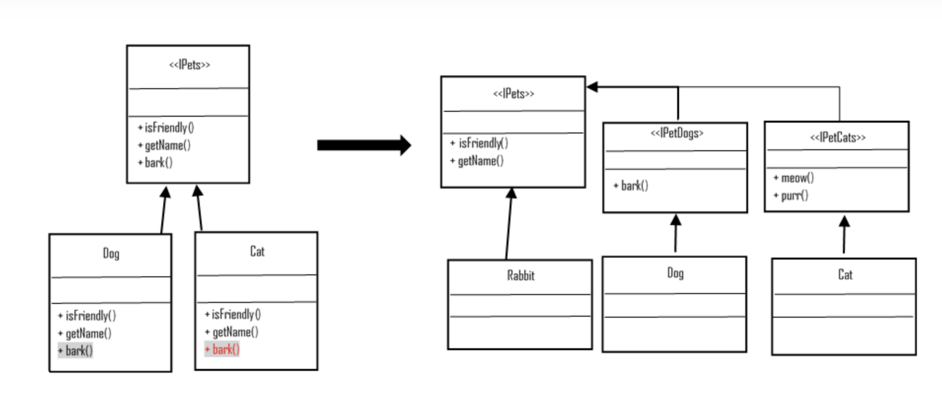 LSP 원칙의 핵심은 상속이다. 그런데 주의할 점은, 객체 지향 프로그래밍에서 상속은 기반 클래스와 서브 클래스 사이에 IS-A 관계가 있을 경우로만 제한 되어야 한다. 그 외의 경우에는 합성을 이용하도록 권고되어 있습니다. 따라서 다형성을 이용하고 싶다면 extends 대신 인터페이스로 implements하여 인터페이스 타입으로 사용해야 하며, 상위 클래스의 기능을 이용하거나 재사용을 하고 싶다면 상속(inheritnace) 보단 합성(composition)으로 구성하는게 좋다.