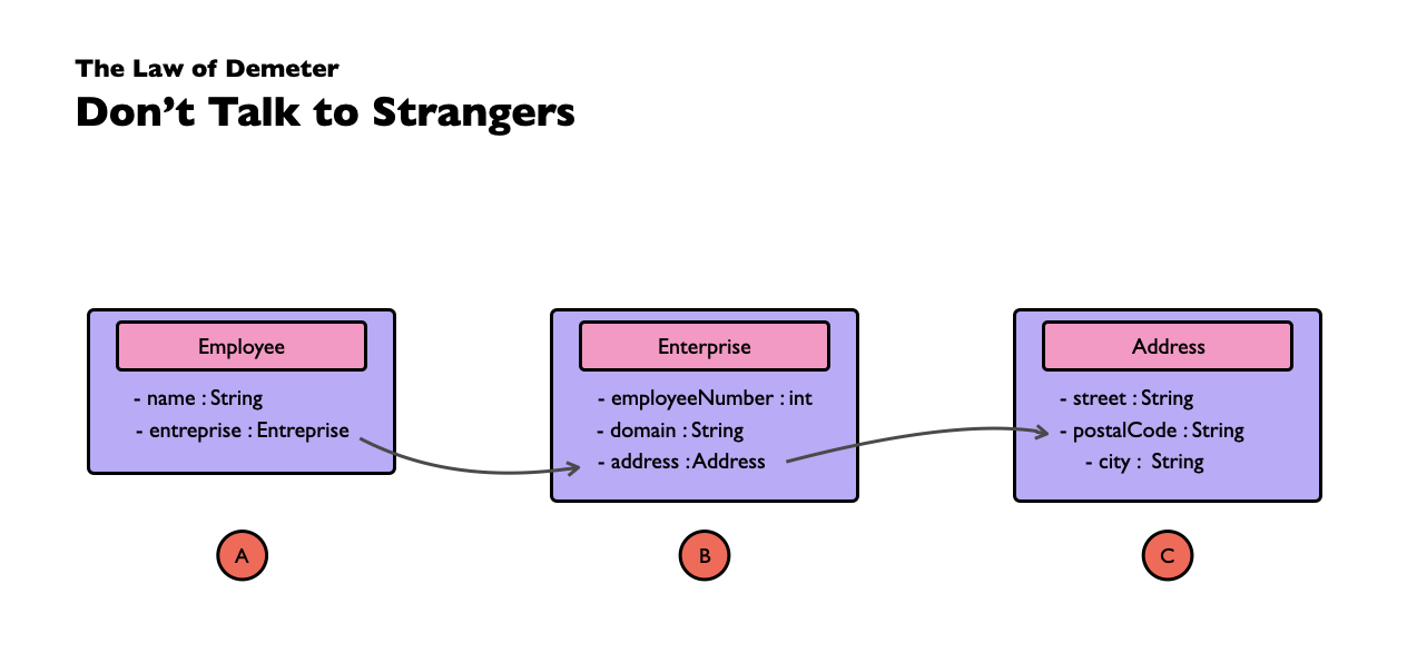 "최소한의 지식 원칙(The Principle of Least Knowledge)"으로 알려져 있으며, 모듈은 자신이 조작하는 객체의 속사정을 몰라야 한다는 것을 의미합니다. 즉, 간단하게 말하면 여러개의 .(dot)을 최대한 사용하지 말라는 법칙으로 말할 수 있으며, 디미터 법칙을 준수하게 되면 캡슐화를 높여 객체의 자율성과 응집도를 높일 수 있습니다. 한번 직접적인 예시를 통해 좀 더 자세히 알아보겠습니다.