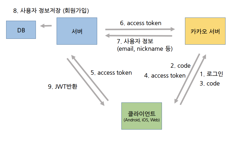 Spring Boot를 이용해서 카카오 로그인을 구현해보았다. Node.js로 구현할 때보다 복잡해보였는데, 구현하고 나니까 그래도 생각보단 덜 복잡했다! 동작 흐름 카카오를 이용한 소셜로그인 구현 Flow이