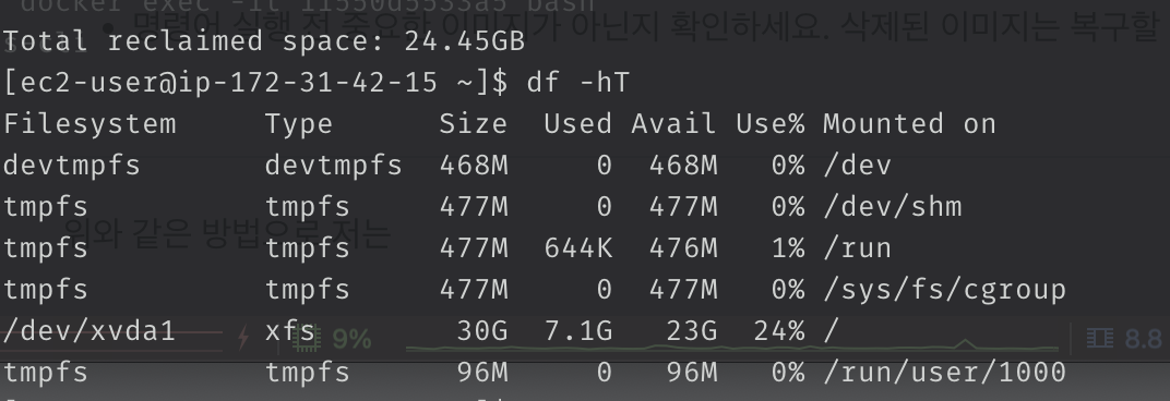 총 24.45GB를 삭제했고, 원래 100프로였던 용량이 24프로로 줄어들었습니다. 도커 이미지 삭제를 주기적으로 해 용량이 부족해지는 일이 없도록 해야겠습니다