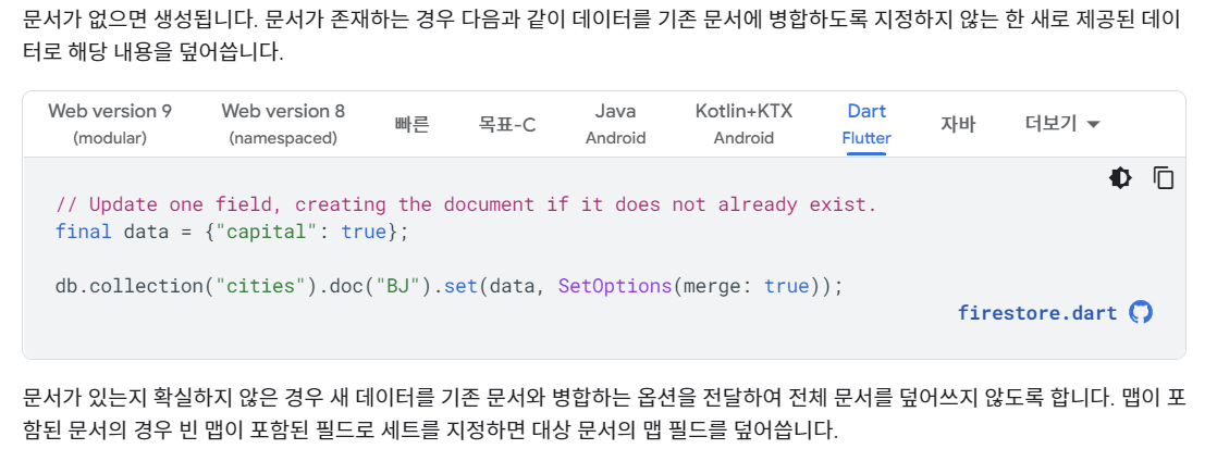 이걸 추가하지 않으면 덮어쓰기가 되어서 User collection에 나머지 정보는 다 날라가고 location와 scope 값만 달랑 남게 된다. 당황하지 말고 뒤에 SetOptions(merge:true)만 붙여주면 된다!