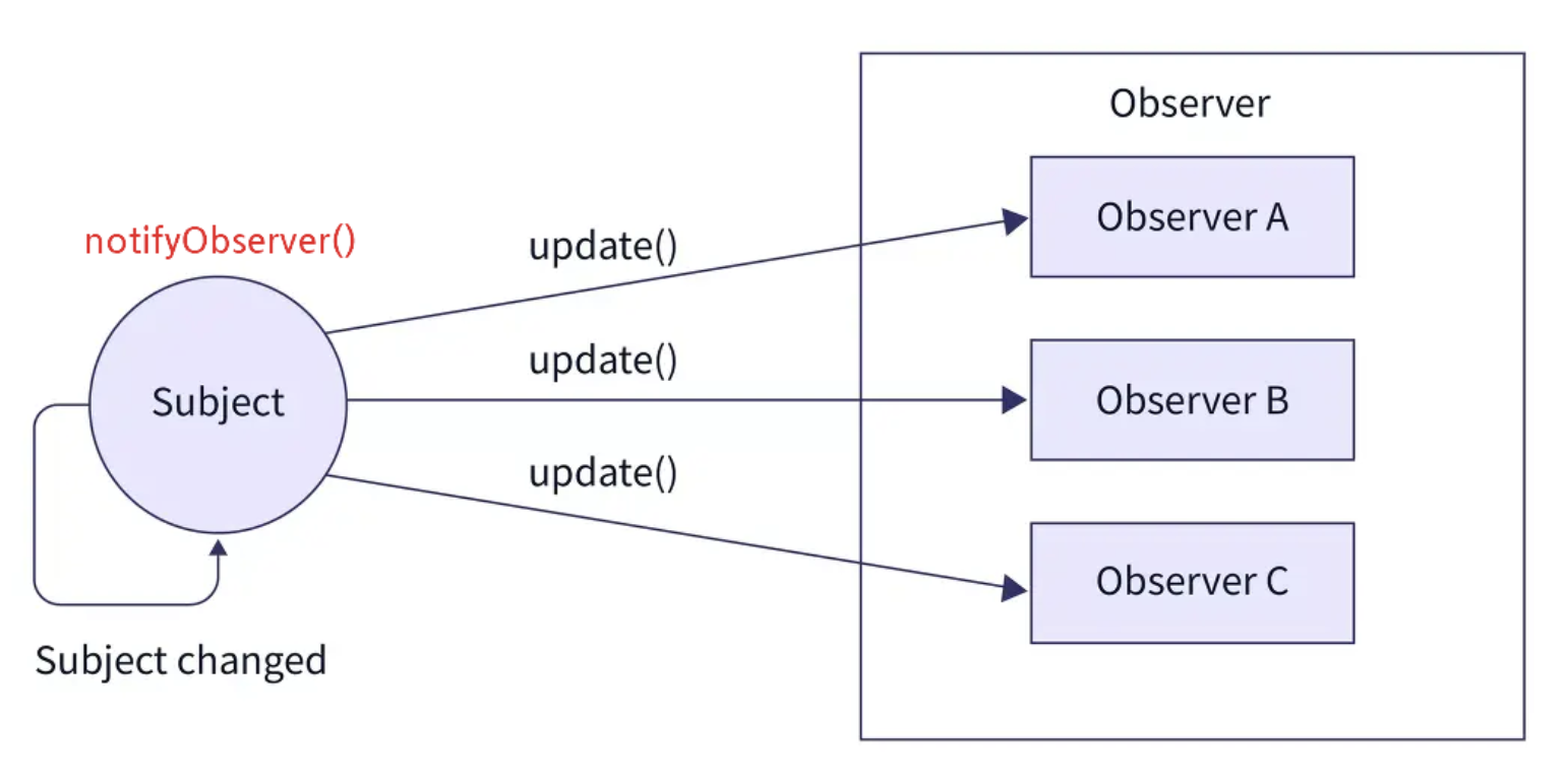 - Subject가 상태를 변경하거나 어떤 동작을 실행할때, Observer 들에게 이벤트 알림(notify)을 발행한다.