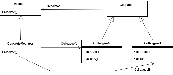 - Colleague : Mediator를 통해 다른 Colleague와 커뮤니케이션을 위한 인터페이스 정의