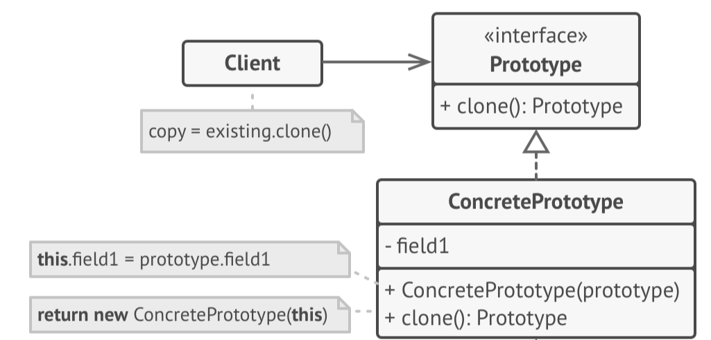 - Prototype: 복제될 객체의 원형을 정의하는 인터페이스. 이 인터페이스는 자신의 복사본을 만드는 clone() 메서드를 포함