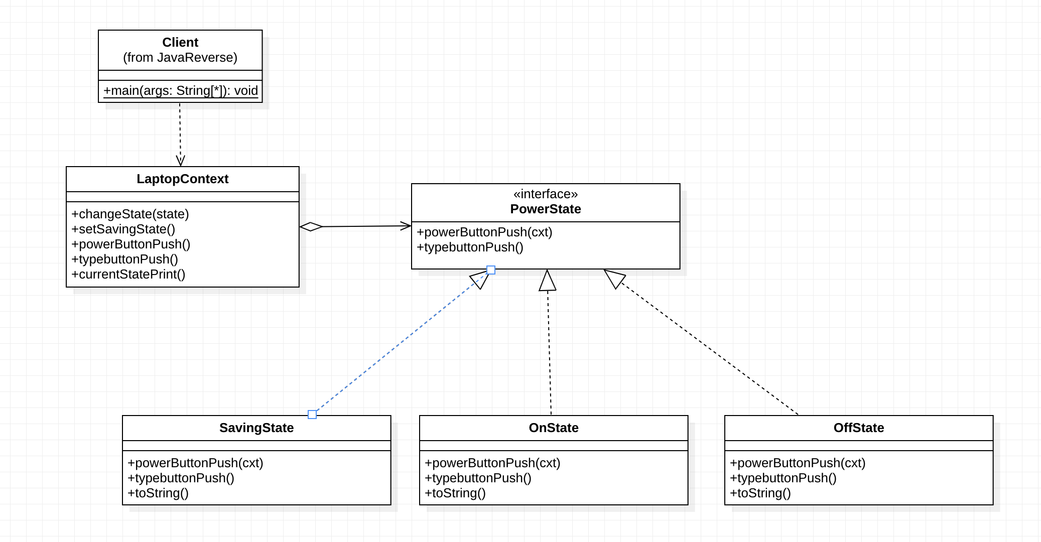 - Context : State를 이용하는 시스템. 시스템 상태를 나타내는 State 객체를 합성(composition)하여 가지고 있다. 클라이언트로부터 요청받으면 State 객체에 행위 실행을 위임한다.