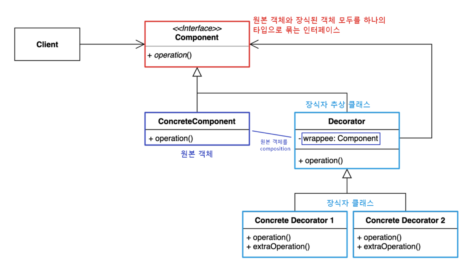 - ConcreteComponent : 원본 객체 (데코레이팅 할 객체)
