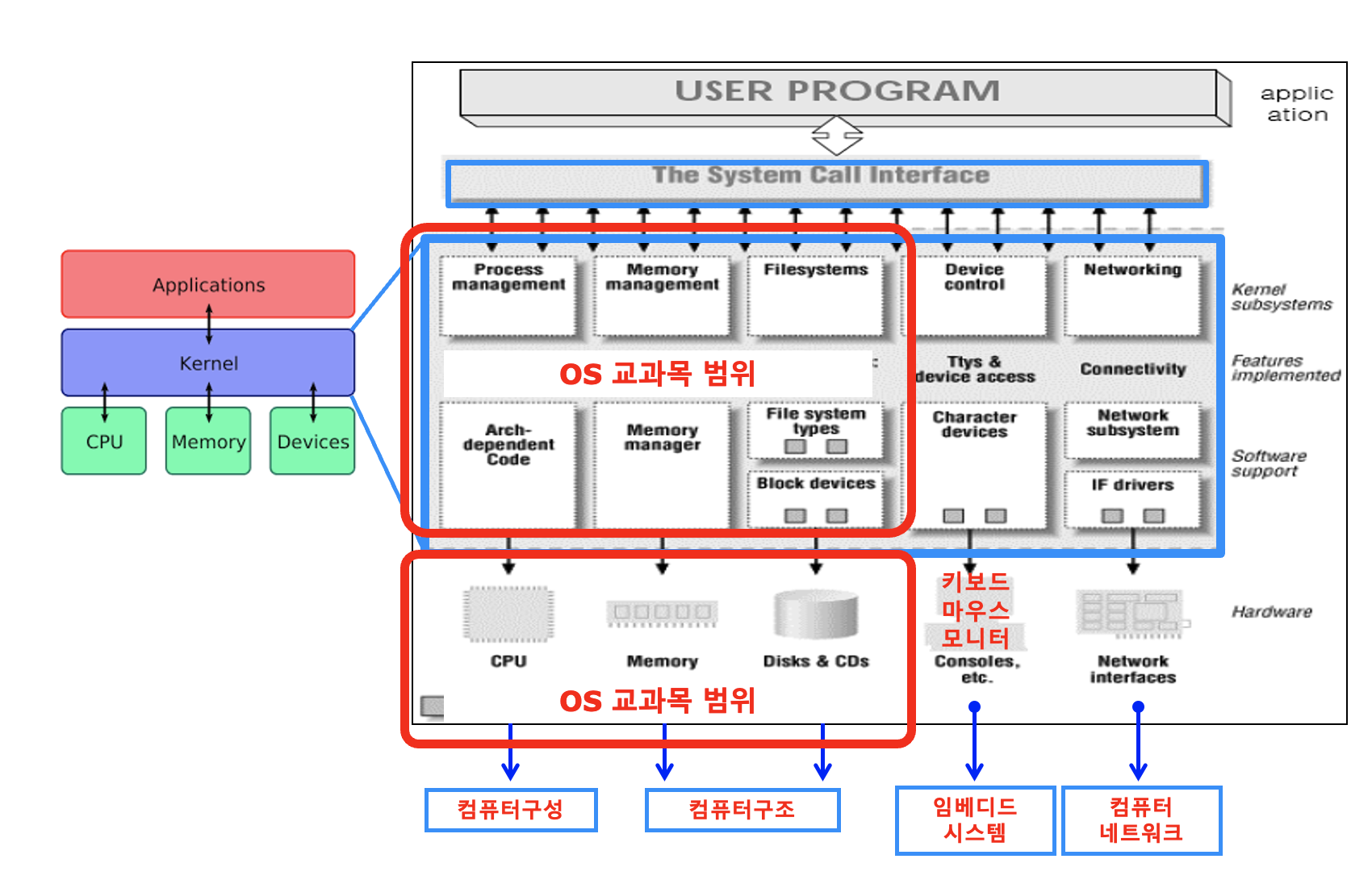 운영체제는 하드웨어를 관리하는 역할을 하며 사용자를 위해 작동한다. 사용자가 컴퓨터 시스템에서 프로그램(소프트웨어)을 구축하거나 실행하고자 할 때 이를 지원한다. 이 시스템은 CPU, 메모리(레지스터, 캐시, 주 메모리 포함), HDD(또는 SSD), 장치, 네트워크 인터페이스로 구성된다. 따라서 컴퓨터 하드웨어가 각각 개별적으로 및 협력적으로 어떻게 작동하는지를 잘 이해하는 것이 중요.