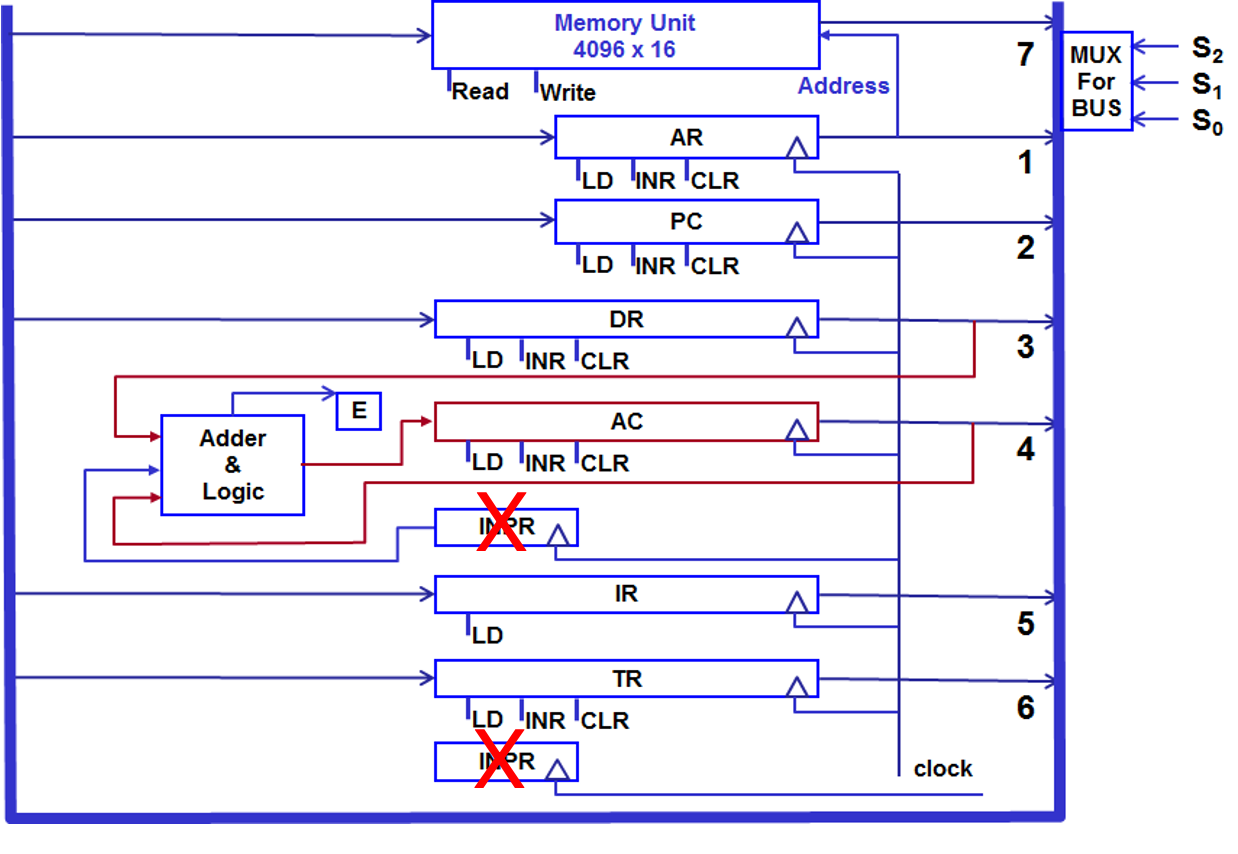 데이터 (연산의 두 번째 피연산자 또는 결과)를 보관 데이터는 메모리에서 DR로 로드되거나, DR에서 메모리로 결과를 저장할 때 사용된다 1st Path of Data: Memory -> (operand) -> DR AC<-AC+DR 2nd Path of Data: AC-> DR -> (result) -> Memeory |