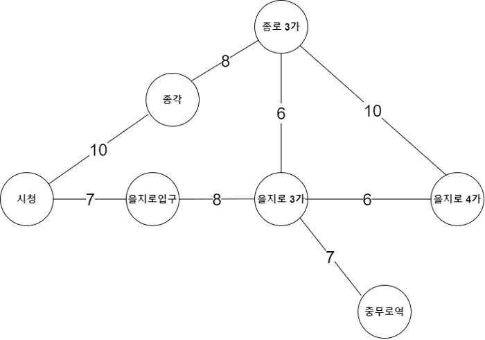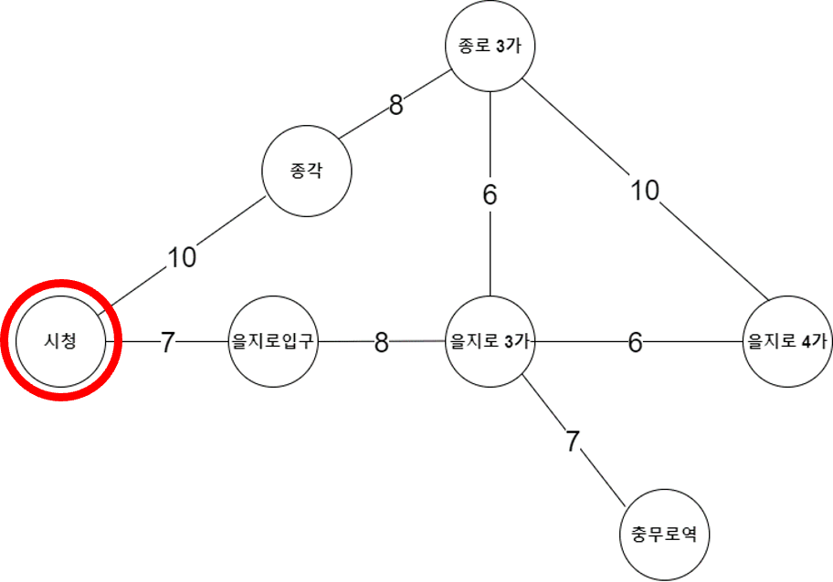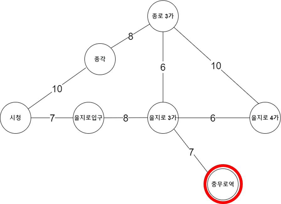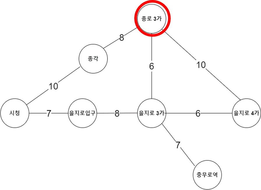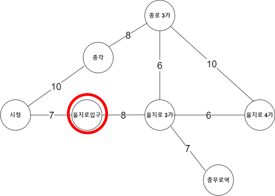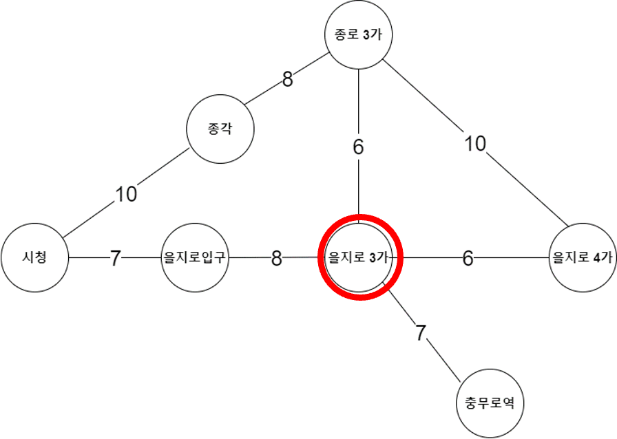 우선순위 큐에 있는 (거리: 7, 노드: 을지로3가) 노드를 뽑아 을지로 3가를 탐색한다.