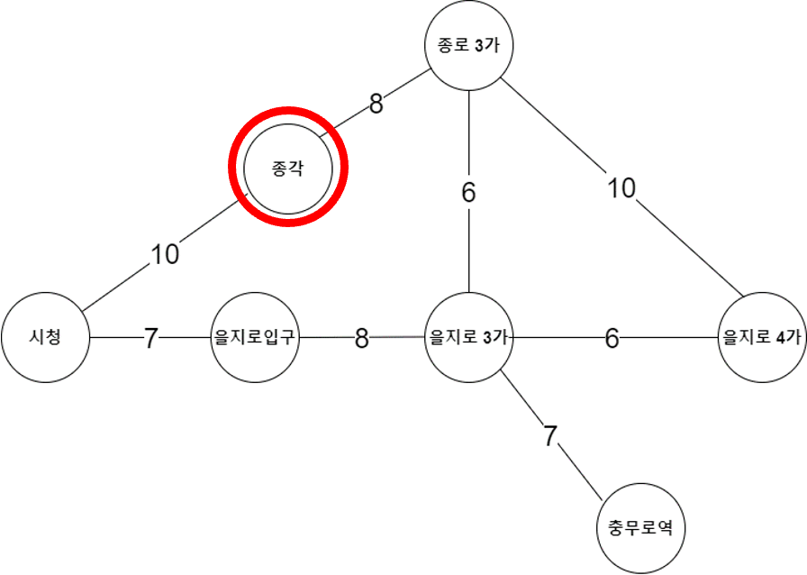 | 우선순위 큐 (거리: 13, 을지로4가), (거리: 15, 을지로입구) (거리:21, 종각) |