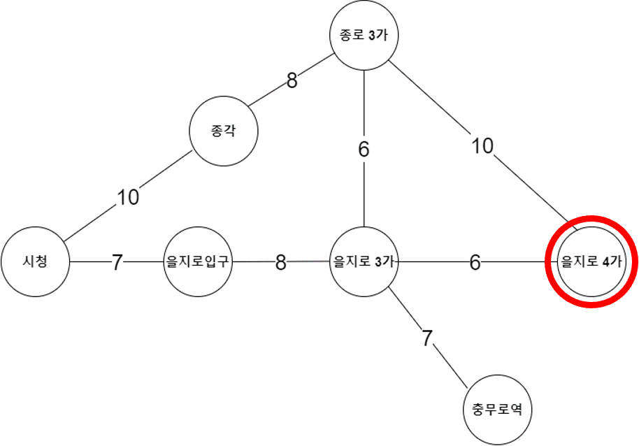 우선순위 큐에서 가장 앞에 있는 (거리: 13, 을지로4가) 노드를 뽑아 을지로 4가를 탐색한다.