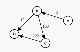 다음과 같은 경우에 다익스트라 알고리즘은 A->B->D 총 비용 22가 가장 최소 경로라고 생각 할 것이다. (A-B-D<A-B-C이므로) 하지만 A->B->C->D가 총-90 으로 값이 더 작다. 즉, 위와 같이 음의 가중치가 포함된 그래프의 최단 경로는 다익스트라 알고리즘으로 구할 수 없는 경우가 있다.