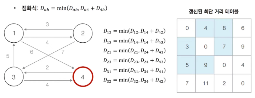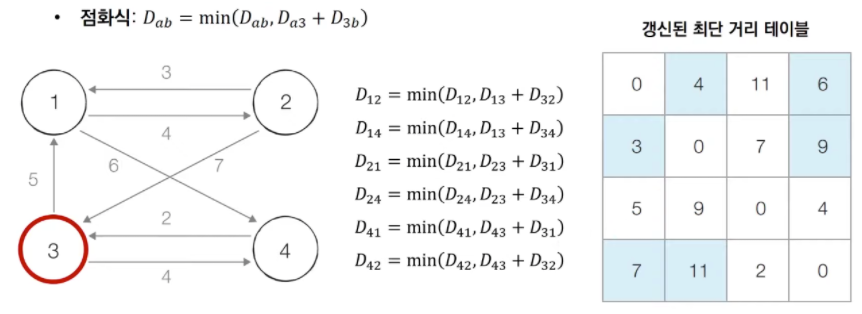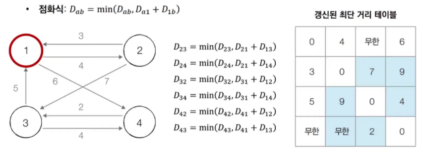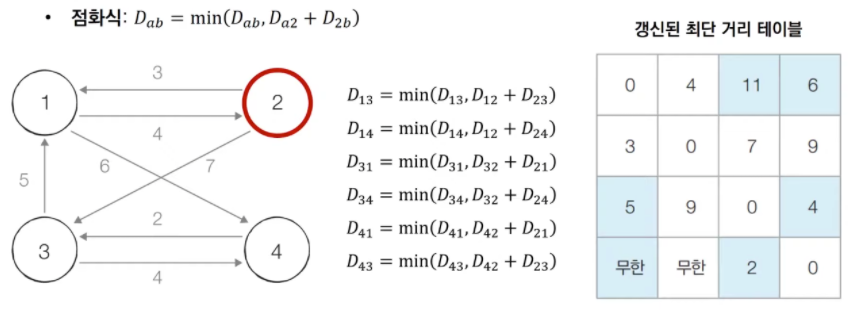 - 매 단계마다 현재 노드를 거쳐 가는 노드를 기준으로 알고리즘을 수행
