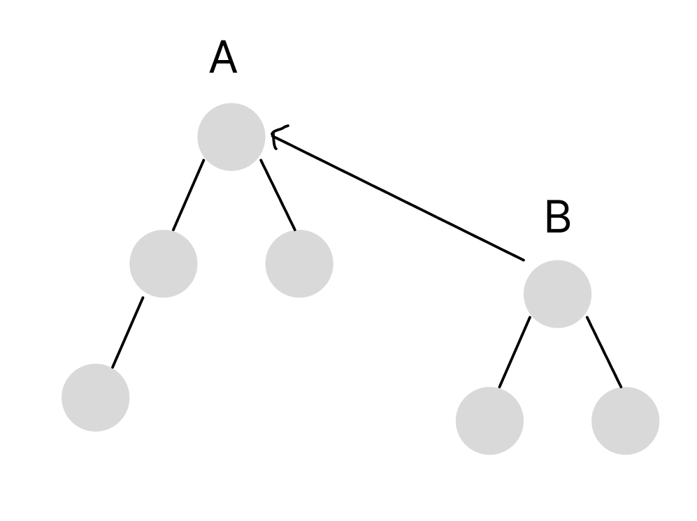 위에서 만든 find로 각 트리의 대표 노드를 찾고, 같지 않을 경우 B가 아닌 B의 대표 노드의 값을 A 노드의 대표 노드 값으로 바꿔야 한다.