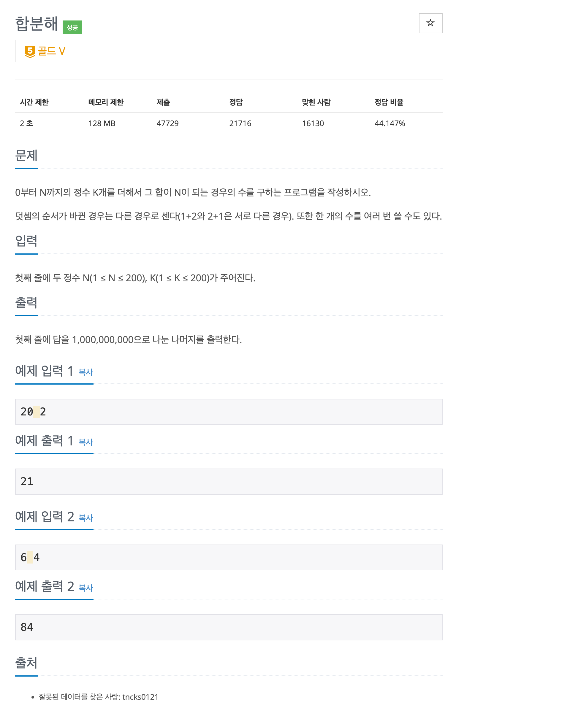dp[K][N]: N이하의 정수를 K번 더해서 합이 N이 되는 경우의 수